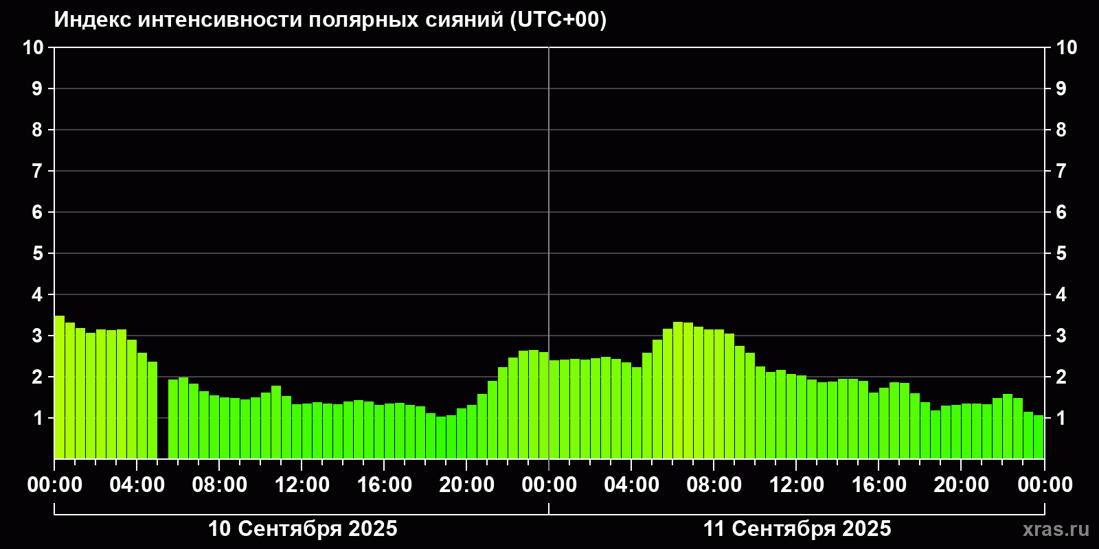 Изменения индекса интенсивности полярных сияний с 2025-09-10 по 2025-09-11 по местному времени