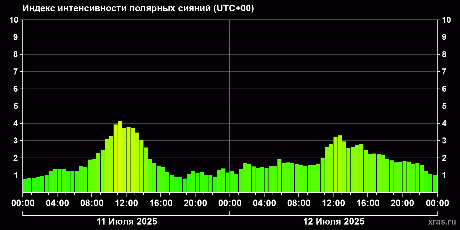 Изменения индекса интенсивности полярных сияний с 2025-07-11 по 2025-07-12 по местному времени