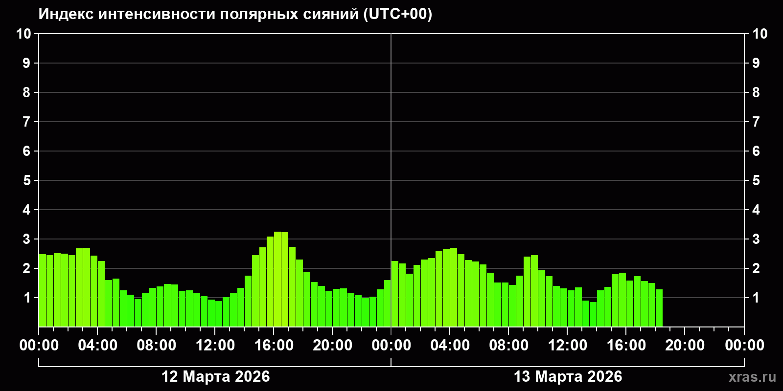 Изменения индекса интенсивности полярных сияний с 2026-03-12 по 2026-03-13 по местному времени