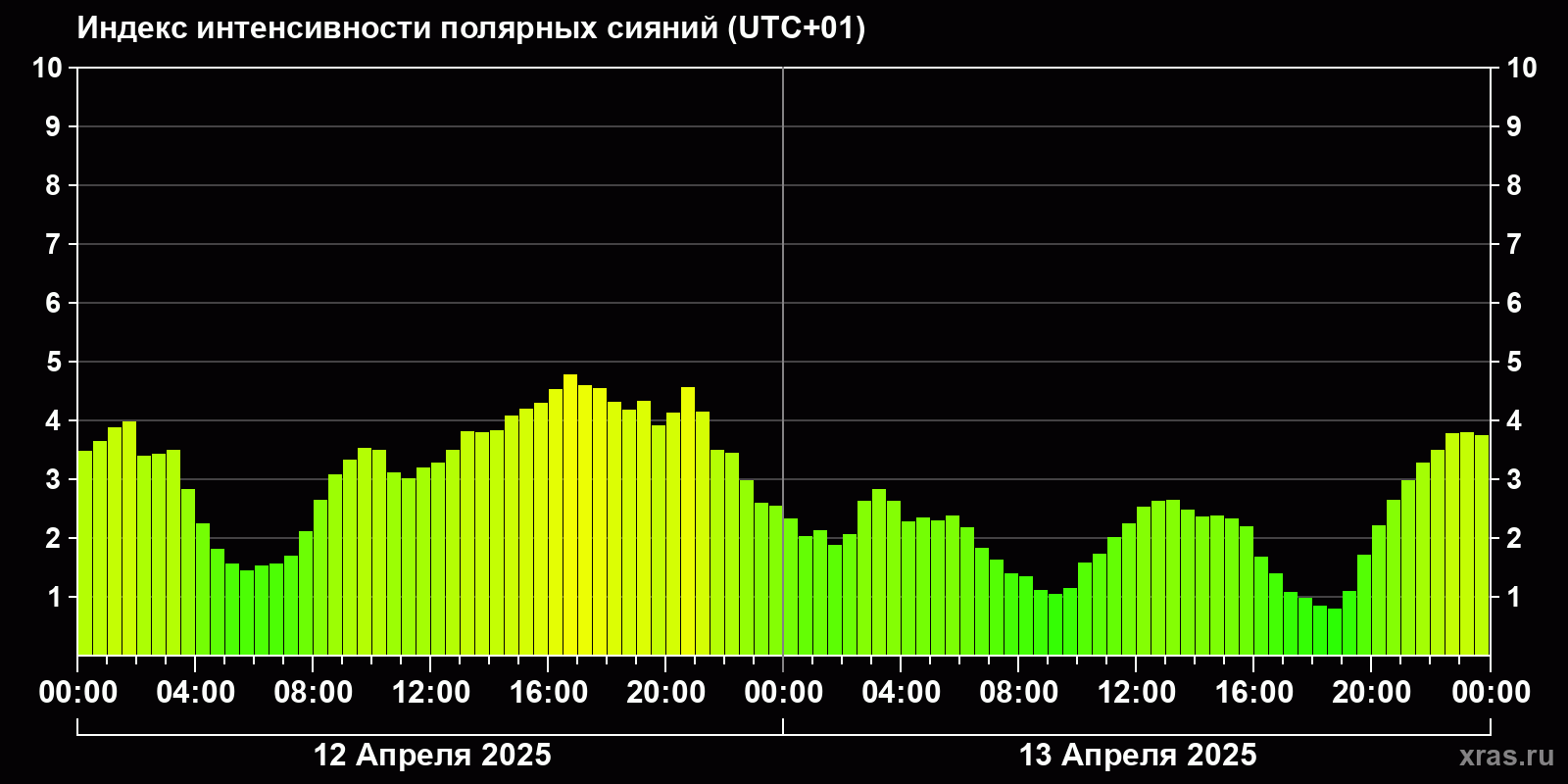 Изменения индекса интенсивности полярных сияний с 2025-04-12 по 2025-04-13 по местному времени