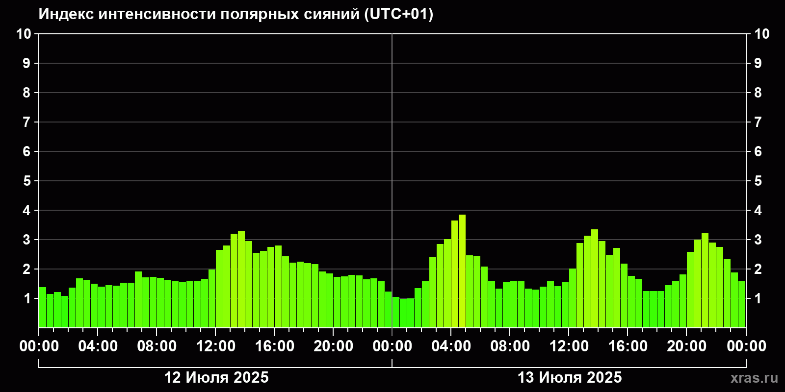 Изменения индекса интенсивности полярных сияний с 2025-07-12 по 2025-07-13 по местному времени