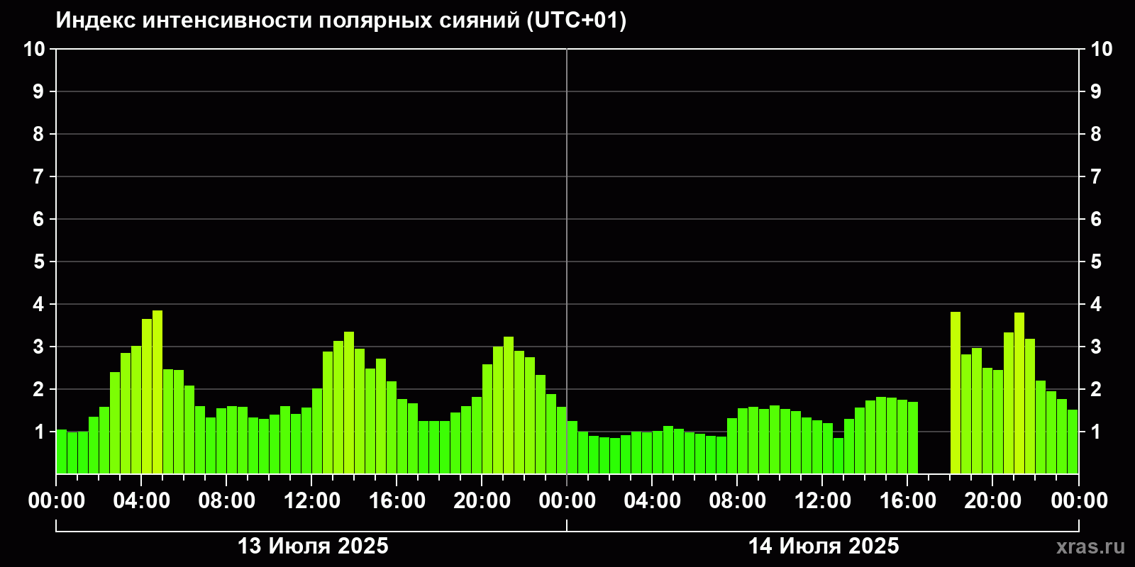 Изменения индекса интенсивности полярных сияний с 2025-07-13 по 2025-07-14 по местному времени