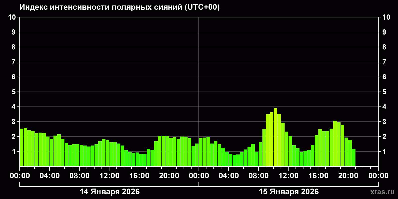 Изменения индекса интенсивности полярных сияний с 2026-01-14 по 2026-01-15 по местному времени