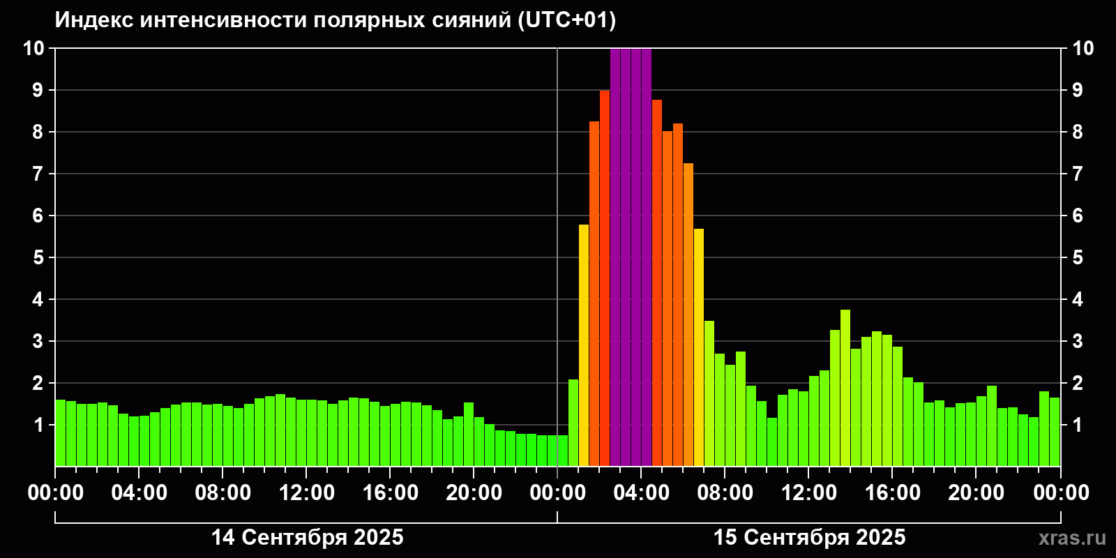 Изменения индекса интенсивности полярных сияний с 2025-09-14 по 2025-09-15 по местному времени