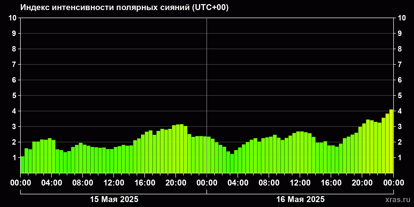 Изменения индекса интенсивности полярных сияний с 2025-05-15 по 2025-05-16 по местному времени
