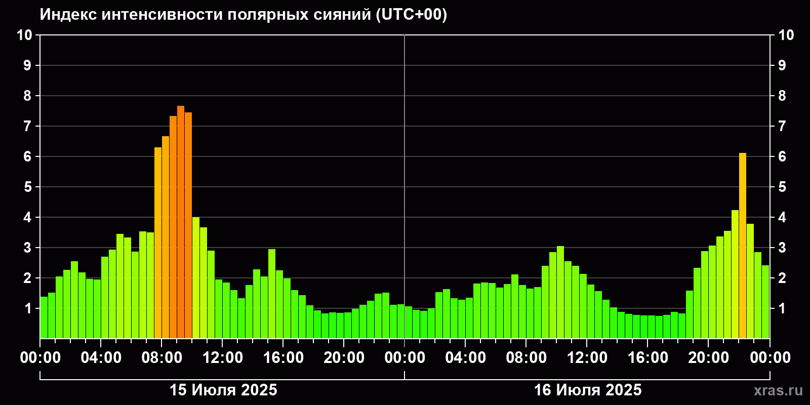 Изменения индекса интенсивности полярных сияний с 2025-07-15 по 2025-07-16 по местному времени