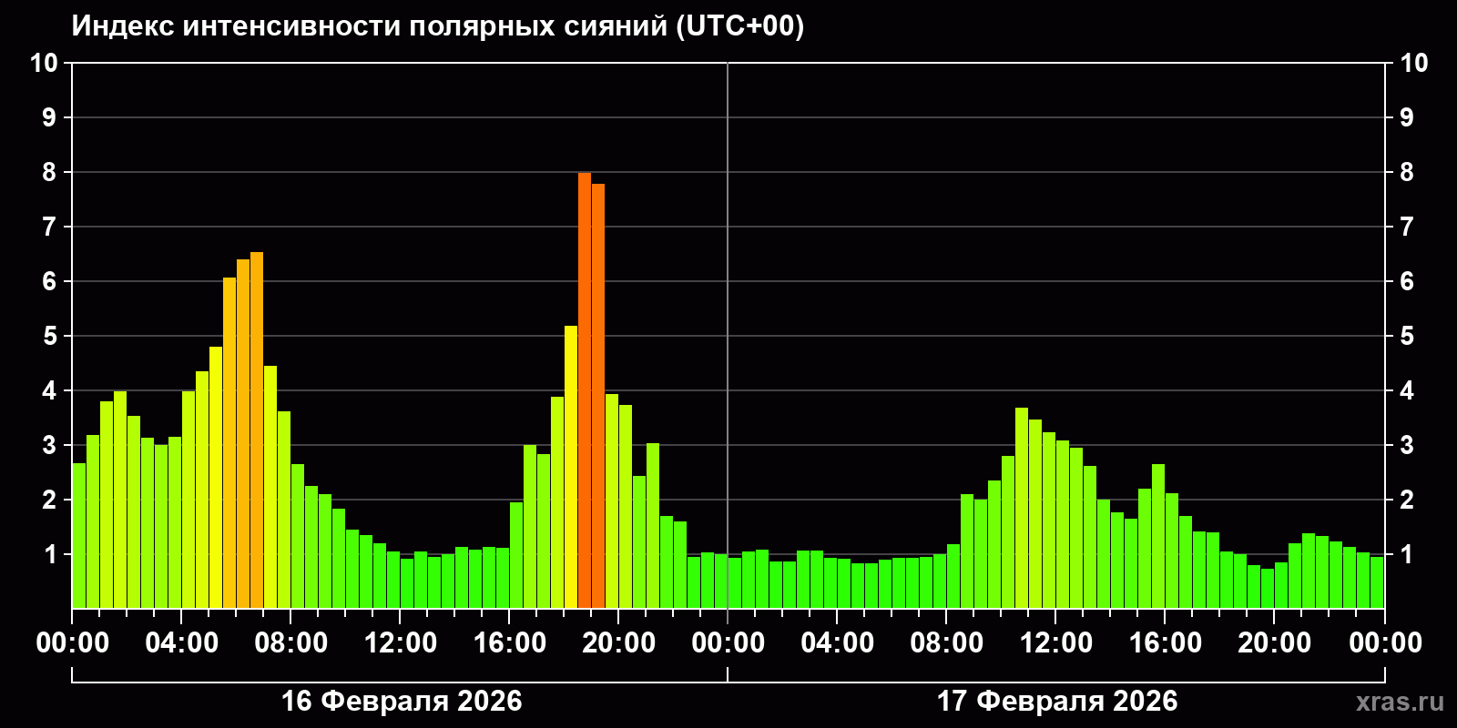 Изменения индекса интенсивности полярных сияний с 2026-02-16 по 2026-02-17 по местному времени