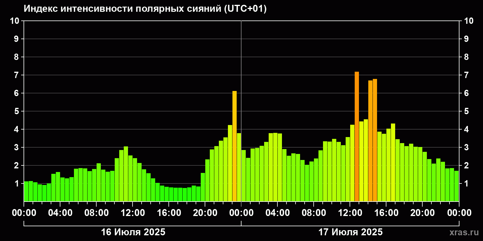 Изменения индекса интенсивности полярных сияний с 2025-07-16 по 2025-07-17 по местному времени