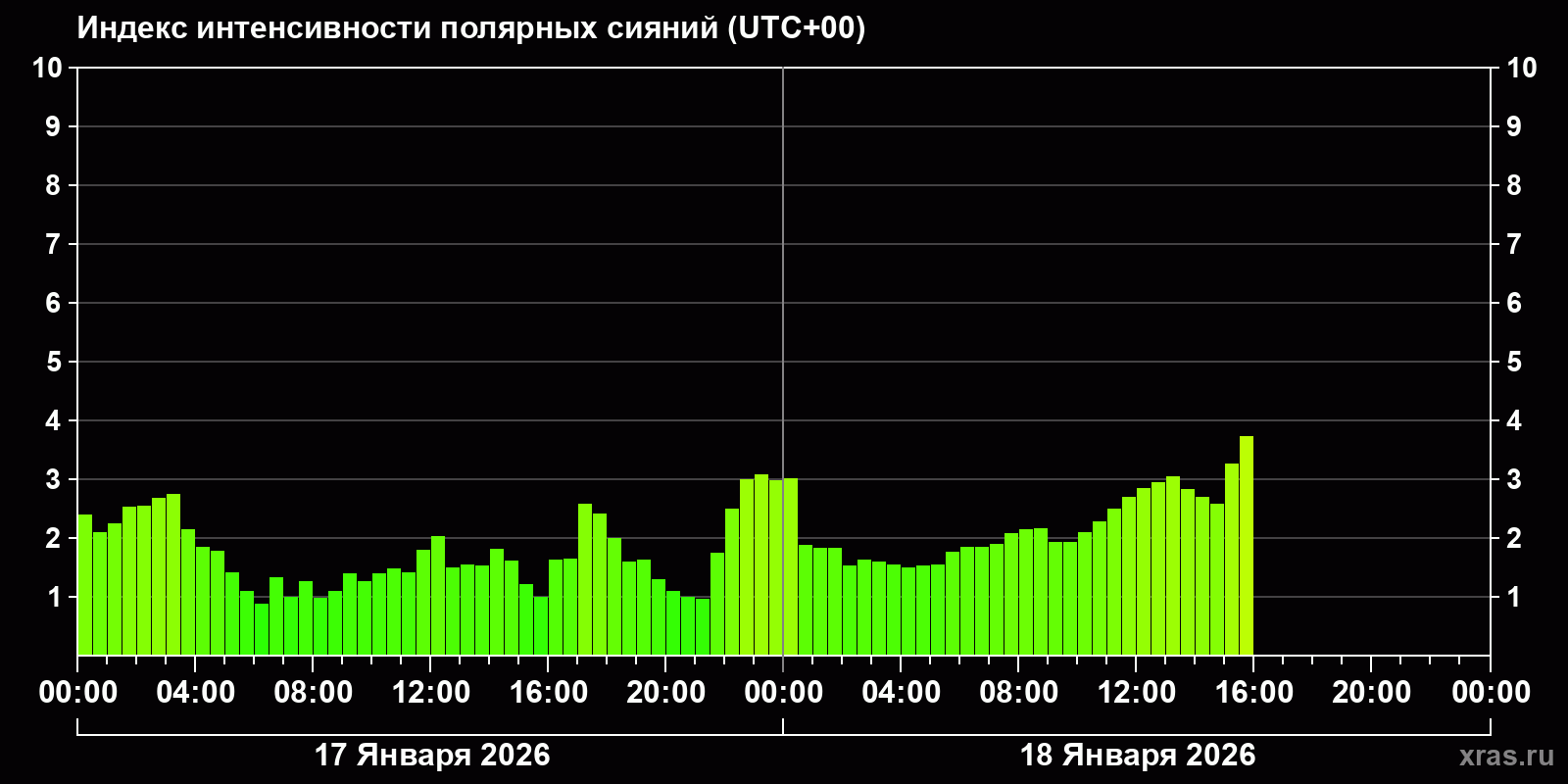 Изменения индекса интенсивности полярных сияний с 2026-01-17 по 2026-01-18 по местному времени
