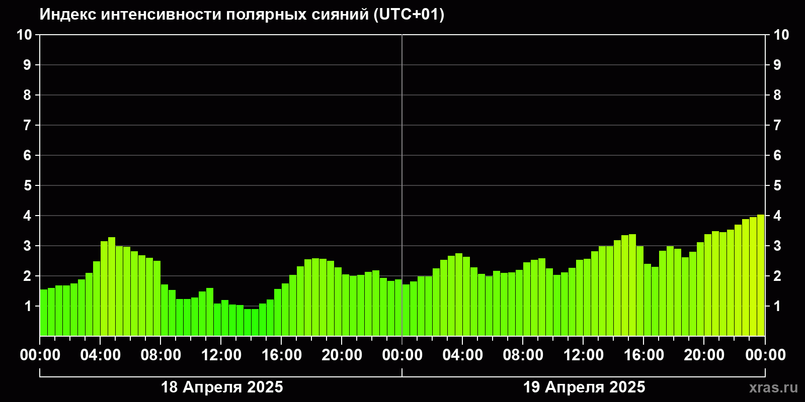 Изменения индекса интенсивности полярных сияний с 2025-04-18 по 2025-04-19 по местному времени