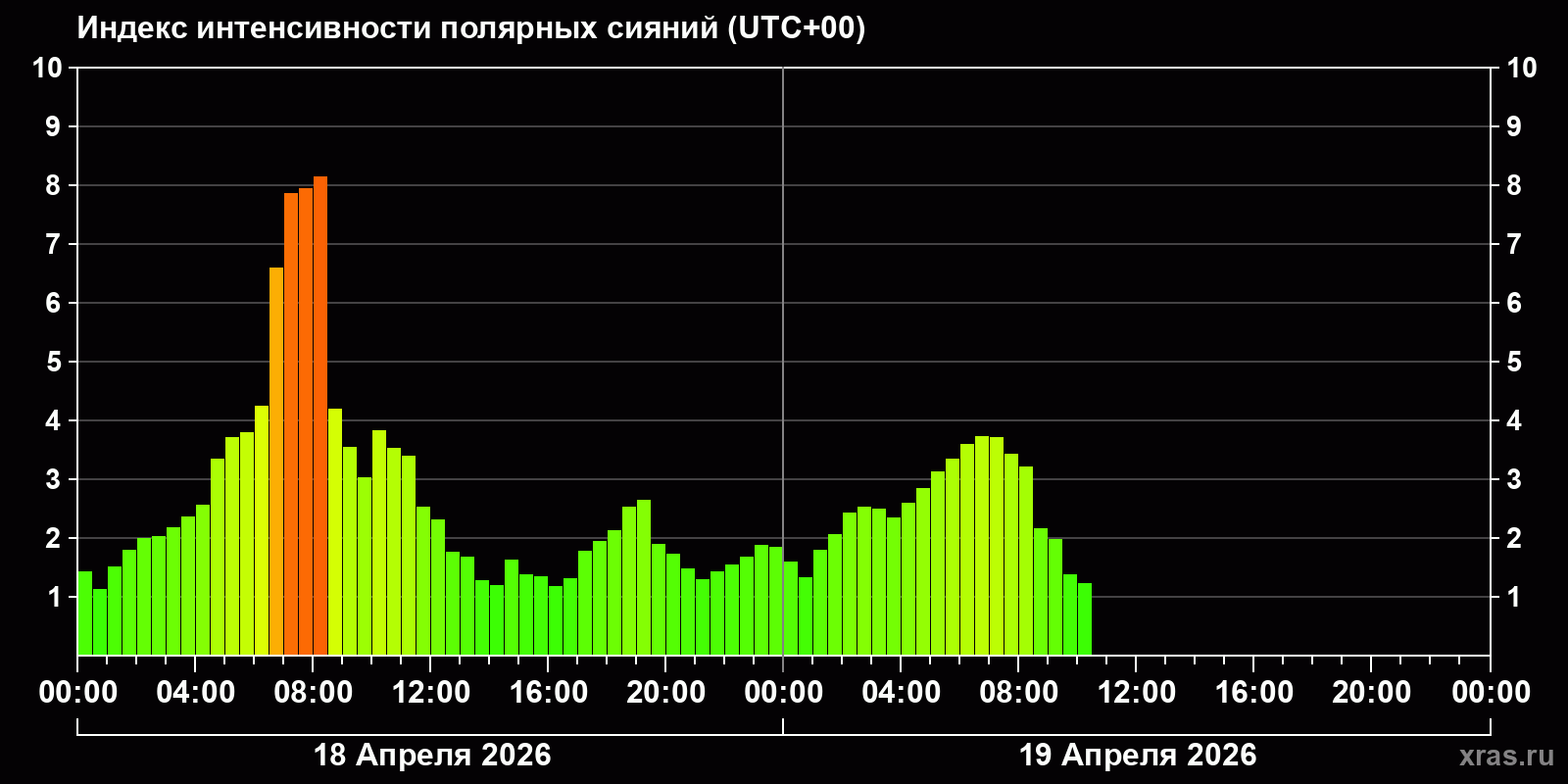 Изменения индекса интенсивности полярных сияний с 2026-04-18 по 2026-04-19 по местному времени