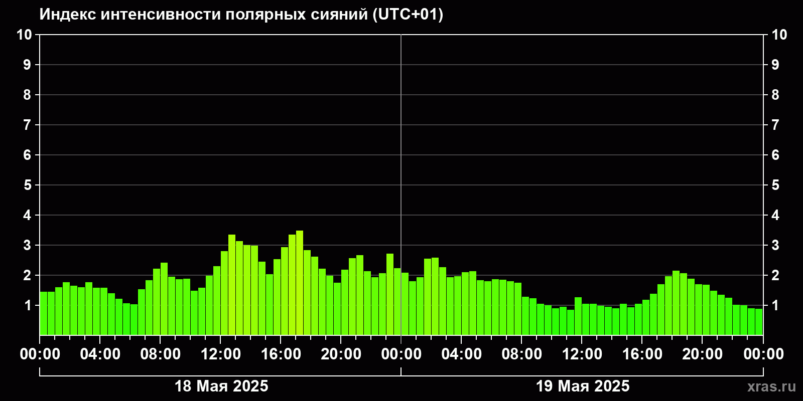 Изменения индекса интенсивности полярных сияний с 2025-05-18 по 2025-05-19 по местному времени