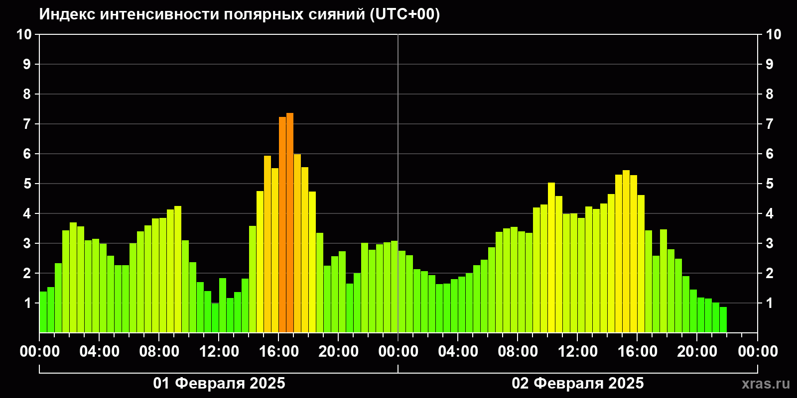 Изменения индекса интенсивности полярных сияний с 2025-02-01 по 2025-02-02 по местному времени