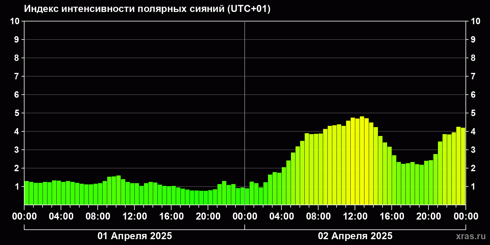Изменения индекса интенсивности полярных сияний с 2025-04-01 по 2025-04-02 по местному времени