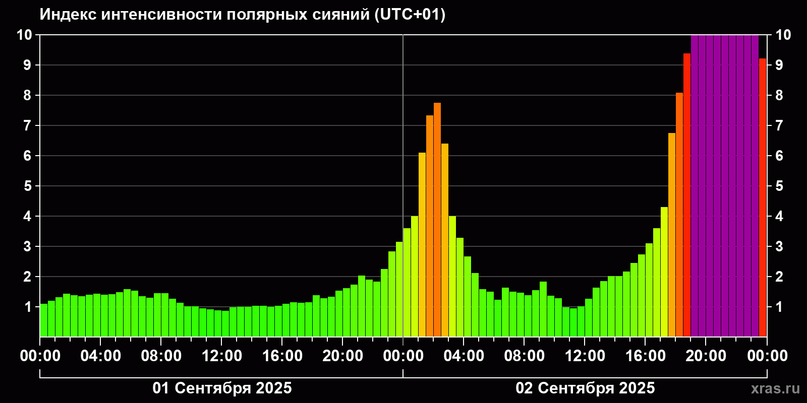 Изменения индекса интенсивности полярных сияний с 2025-09-01 по 2025-09-02 по местному времени