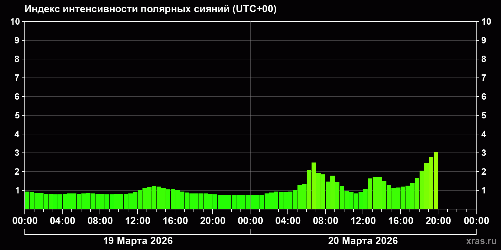 Изменения индекса интенсивности полярных сияний с 2026-03-19 по 2026-03-20 по местному времени