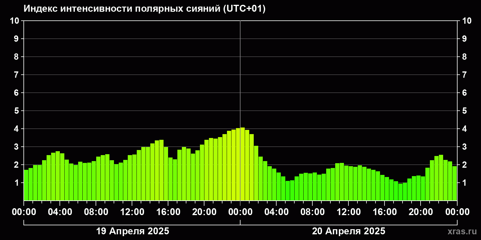 Изменения индекса интенсивности полярных сияний с 2025-04-19 по 2025-04-20 по местному времени