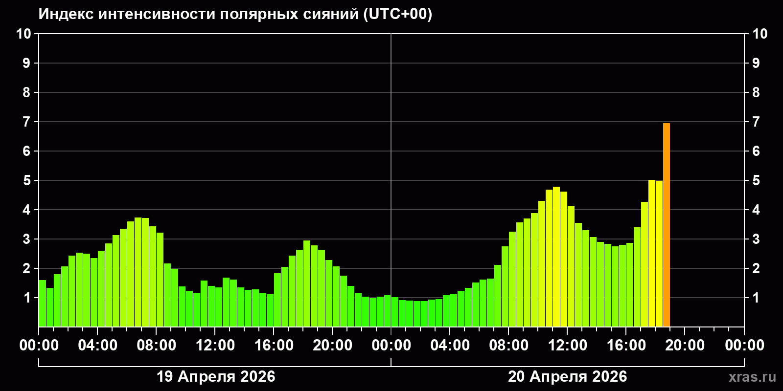 Изменения индекса интенсивности полярных сияний с 2026-04-19 по 2026-04-20 по местному времени