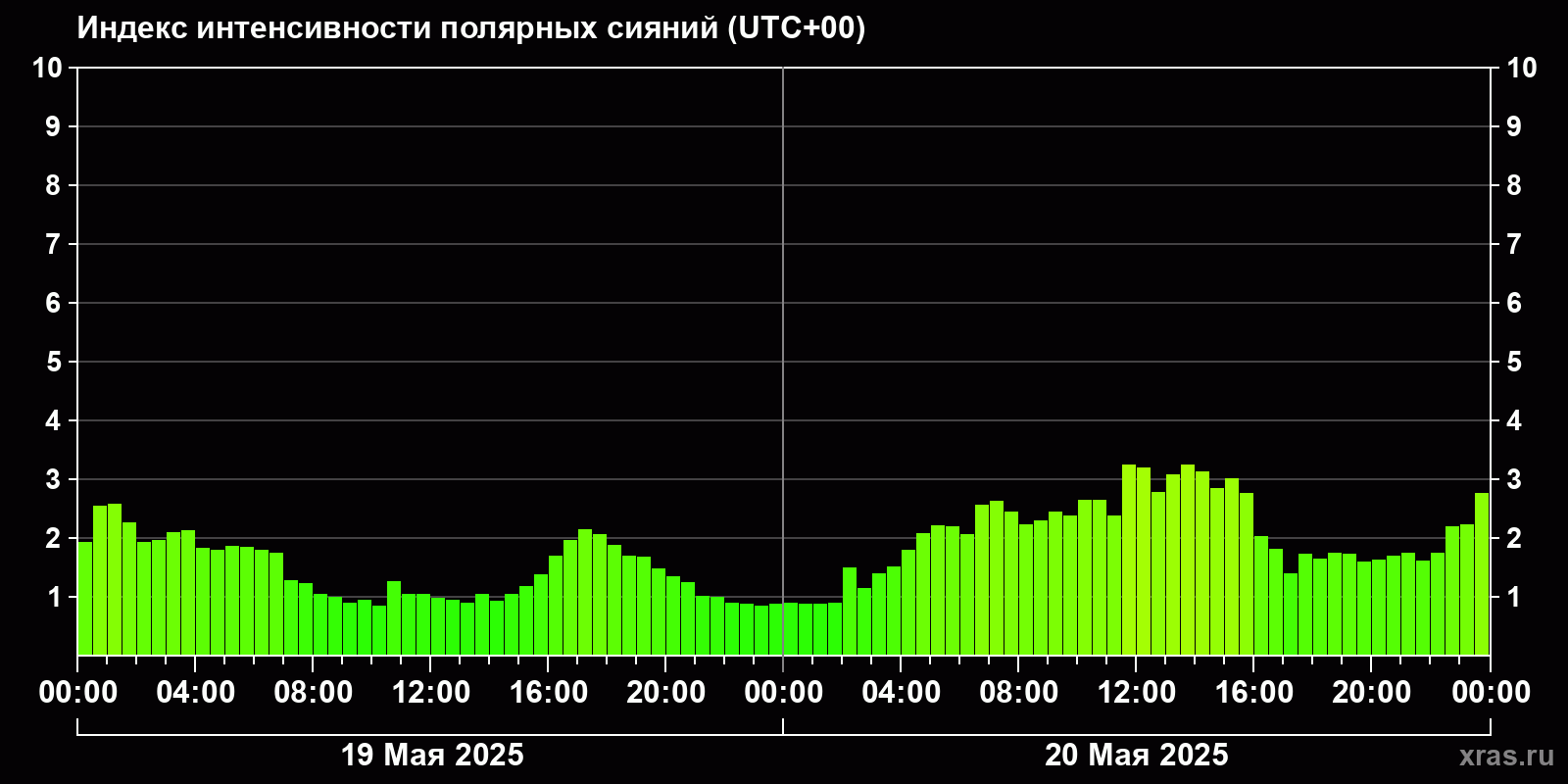 Изменения индекса интенсивности полярных сияний с 2025-05-19 по 2025-05-20 по местному времени