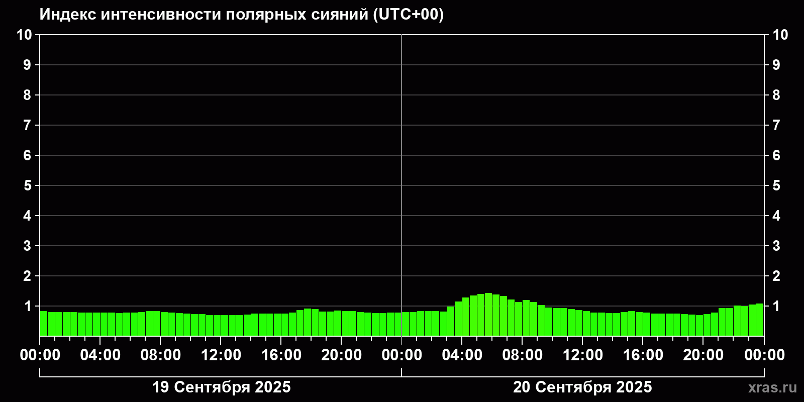 Изменения индекса интенсивности полярных сияний с 2025-09-19 по 2025-09-20 по местному времени