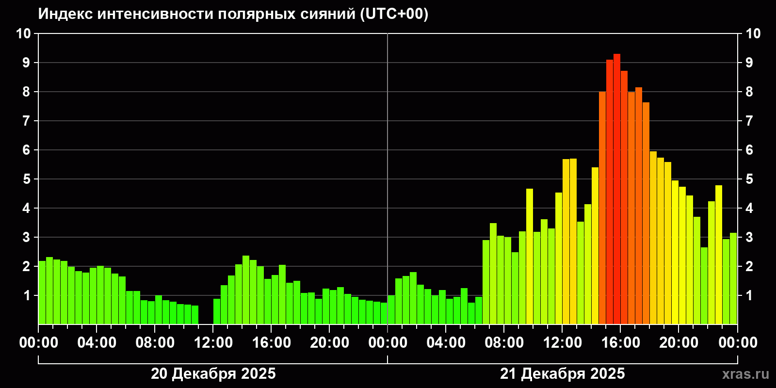 Изменения индекса интенсивности полярных сияний с 2025-12-20 по 2025-12-21 по местному времени
