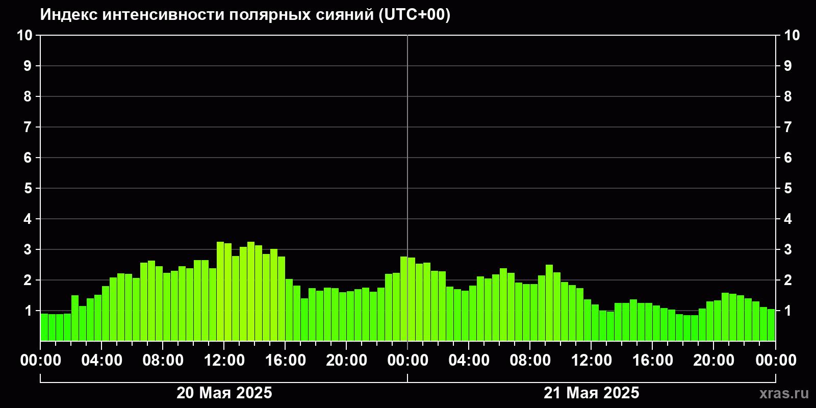 Изменения индекса интенсивности полярных сияний с 2025-05-20 по 2025-05-21 по местному времени