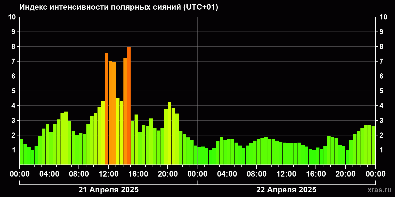 Изменения индекса интенсивности полярных сияний с 2025-04-21 по 2025-04-22 по местному времени