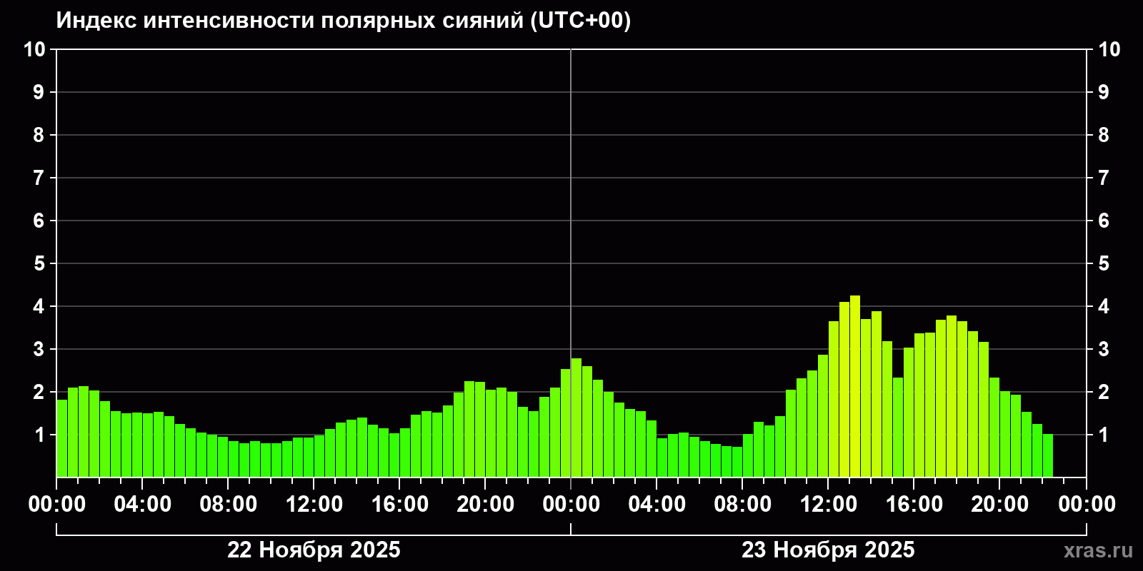 Изменения индекса интенсивности полярных сияний с 2025-11-22 по 2025-11-23 по местному времени
