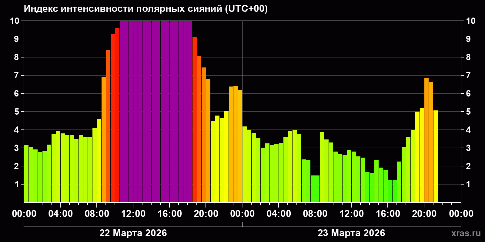 Изменения индекса интенсивности полярных сияний с 2026-03-22 по 2026-03-23 по местному времени