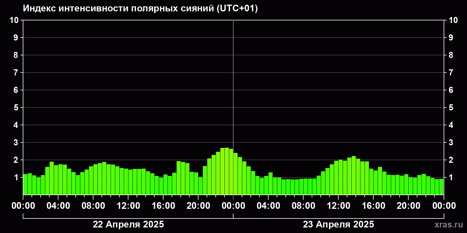 Изменения индекса интенсивности полярных сияний с 2025-04-22 по 2025-04-23 по местному времени