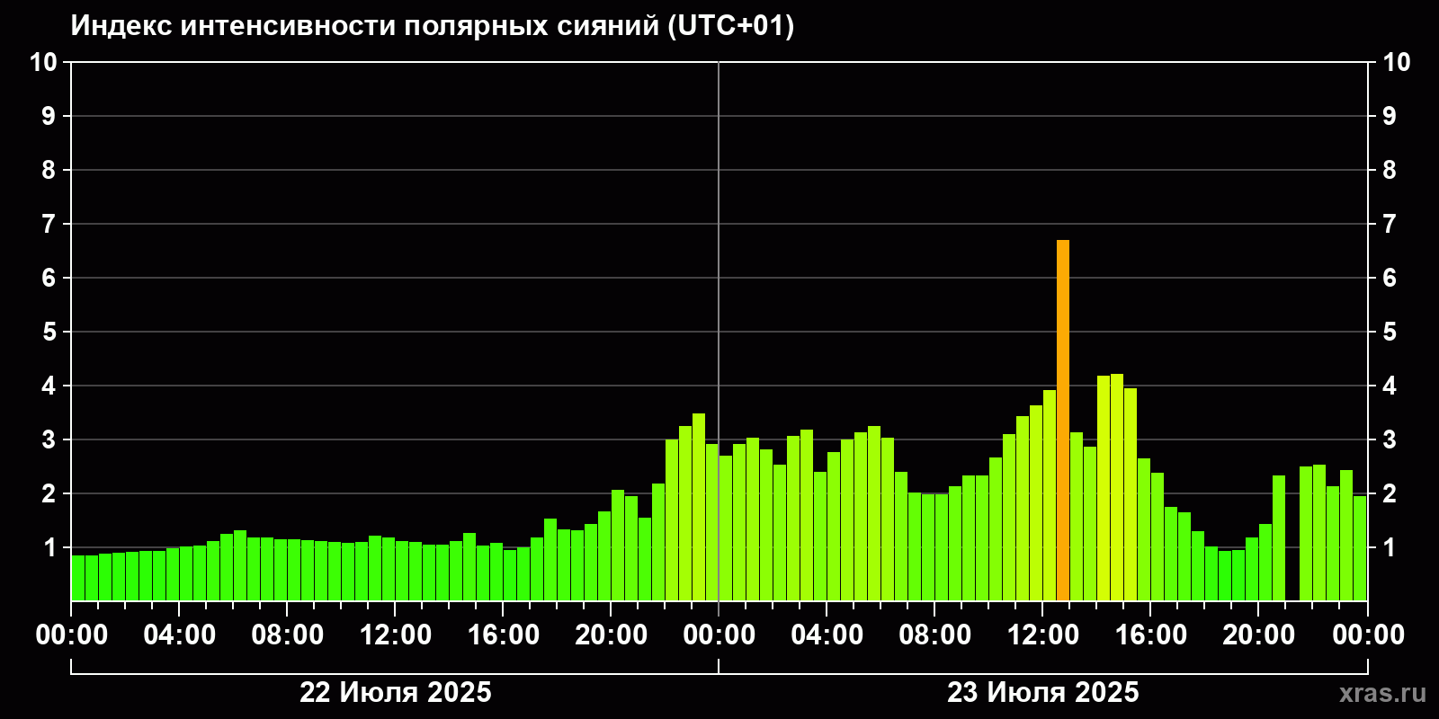 Изменения индекса интенсивности полярных сияний с 2025-07-22 по 2025-07-23 по местному времени
