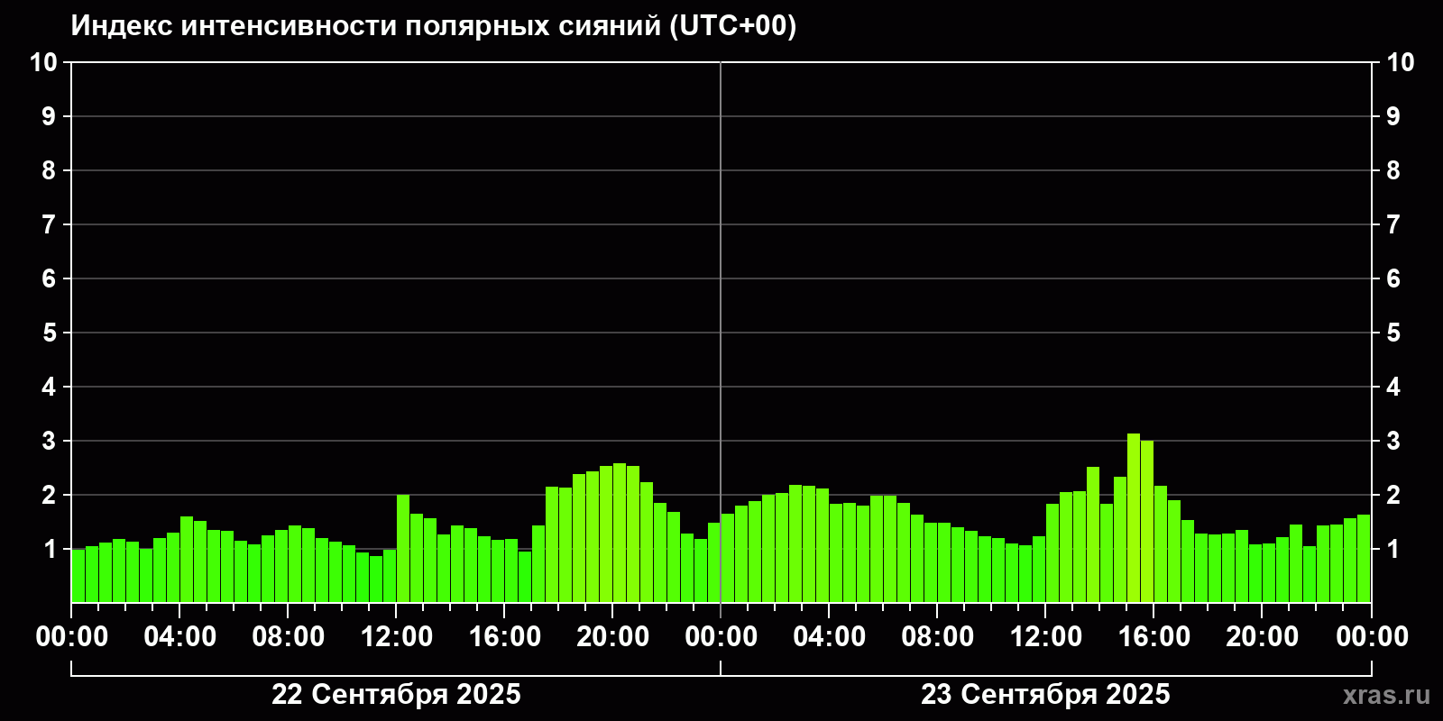 Изменения индекса интенсивности полярных сияний с 2025-09-22 по 2025-09-23 по местному времени