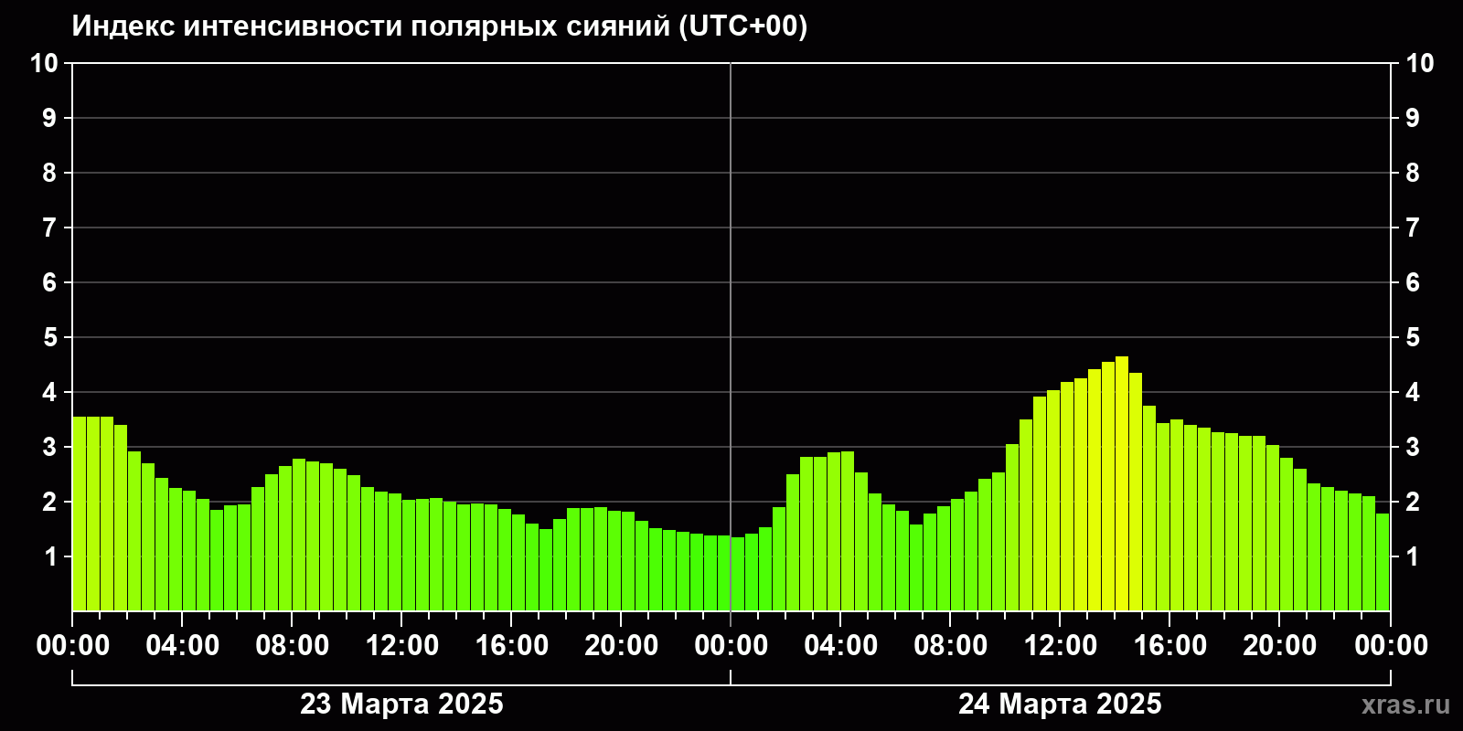 Изменения индекса интенсивности полярных сияний с 2025-03-23 по 2025-03-24 по местному времени