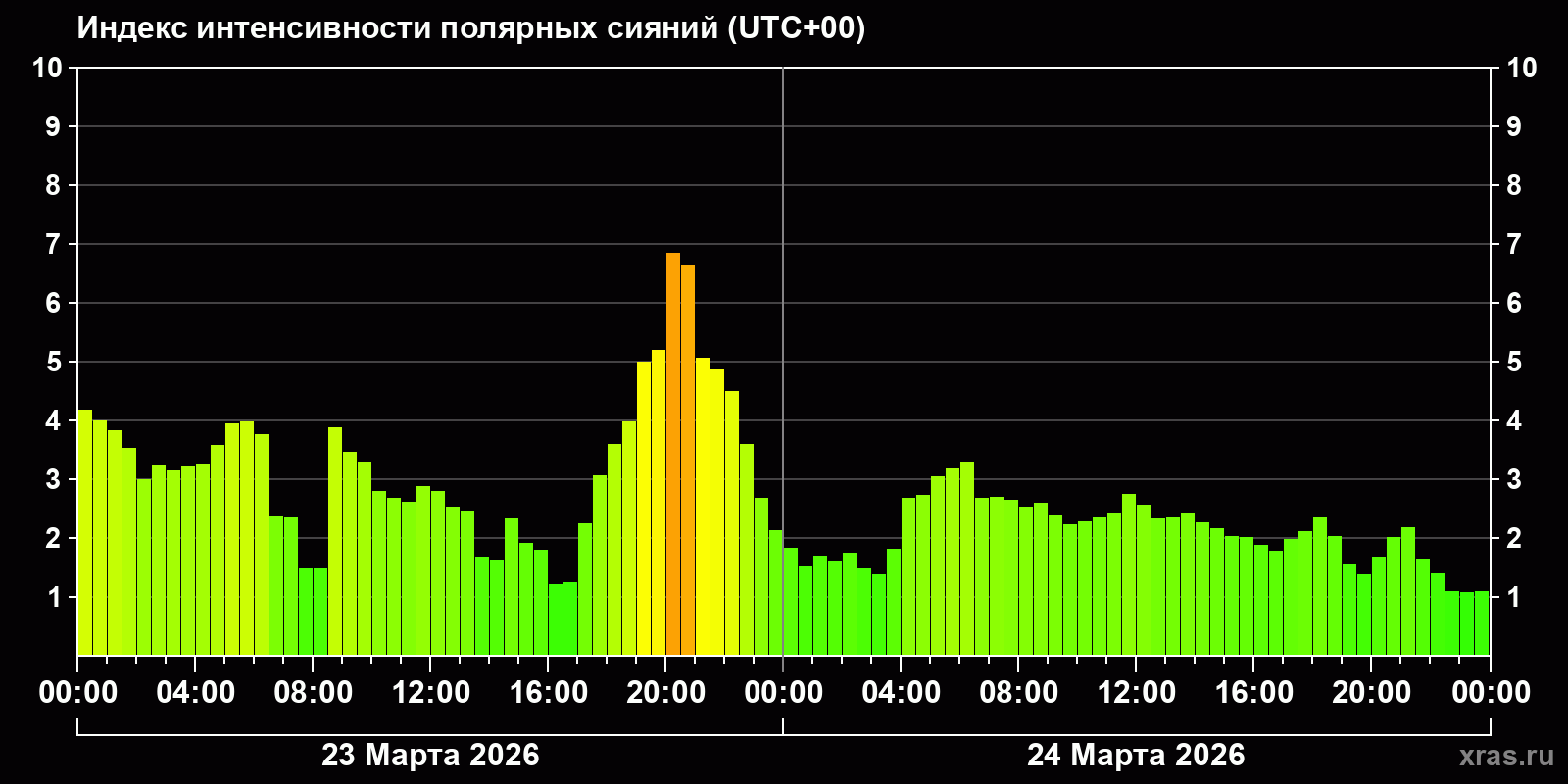 Изменения индекса интенсивности полярных сияний с 2026-03-23 по 2026-03-24 по местному времени