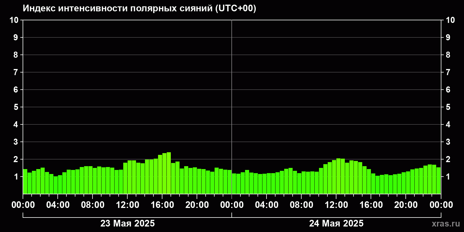 Изменения индекса интенсивности полярных сияний с 2025-05-23 по 2025-05-24 по местному времени