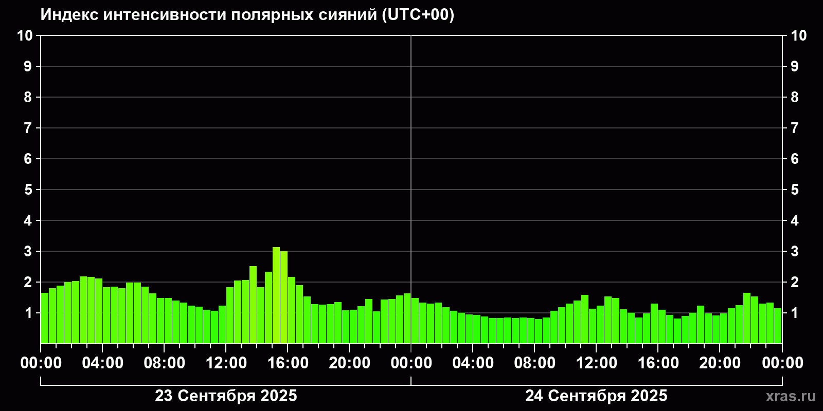 Изменения индекса интенсивности полярных сияний с 2025-09-23 по 2025-09-24 по местному времени