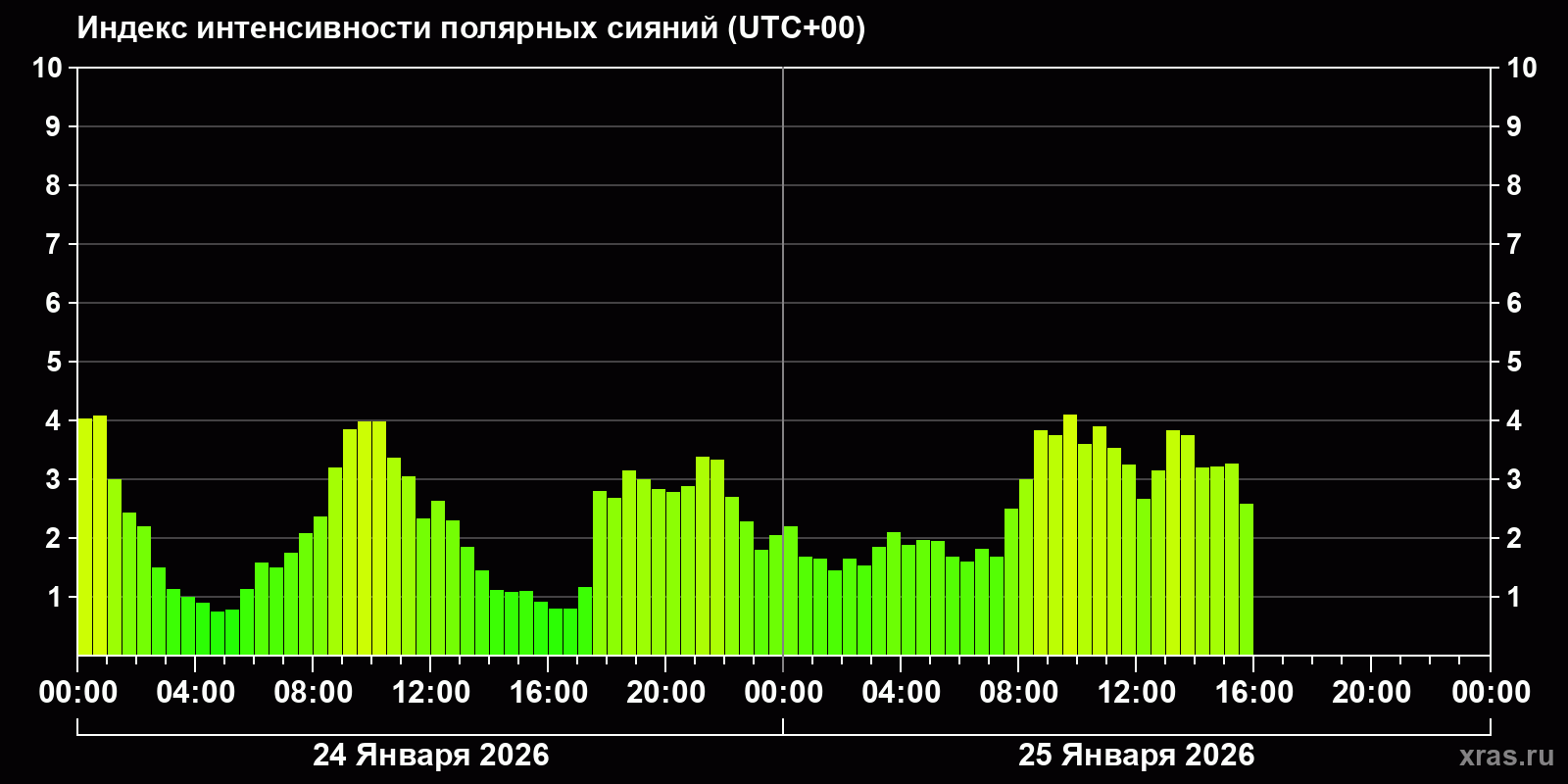 Изменения индекса интенсивности полярных сияний с 2026-01-24 по 2026-01-25 по местному времени