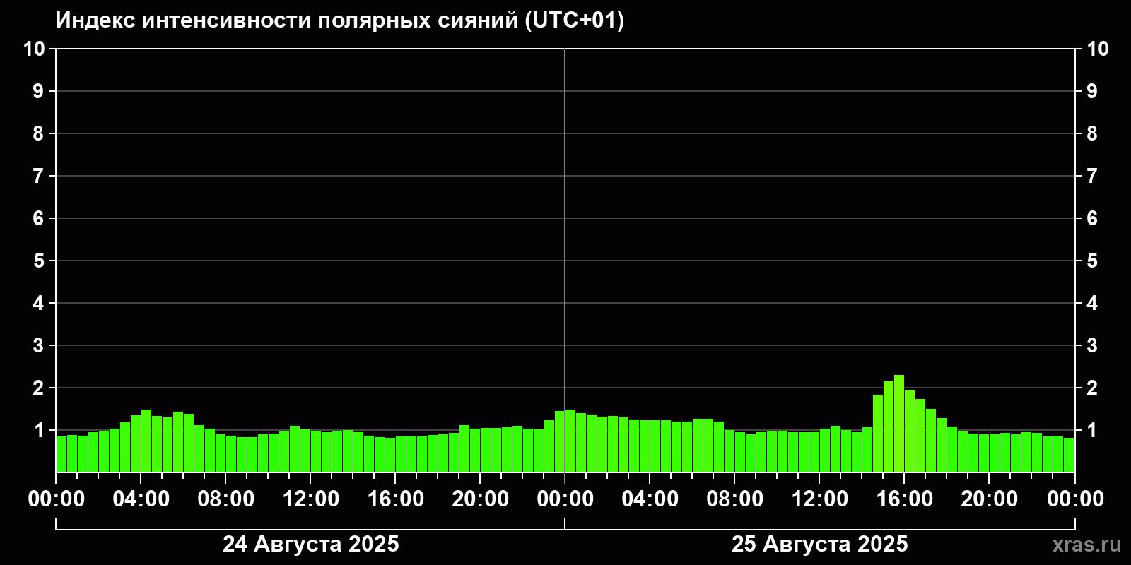 Изменения индекса интенсивности полярных сияний с 2025-08-24 по 2025-08-25 по местному времени
