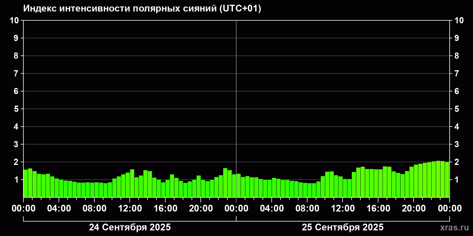 Изменения индекса интенсивности полярных сияний с 2025-09-24 по 2025-09-25 по местному времени