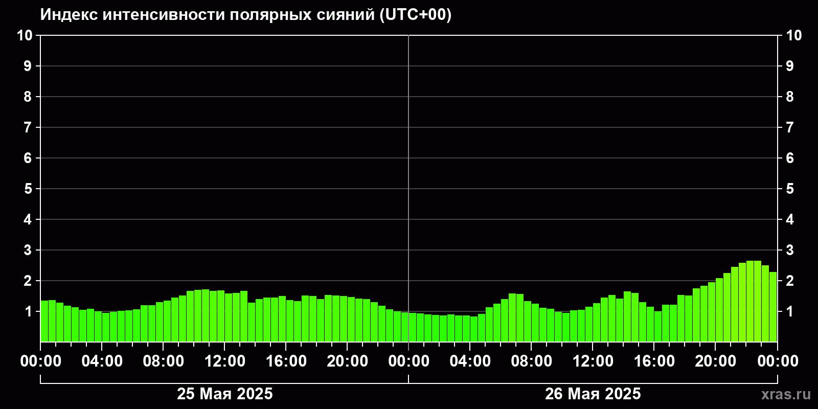 Изменения индекса интенсивности полярных сияний с 2025-05-25 по 2025-05-26 по местному времени