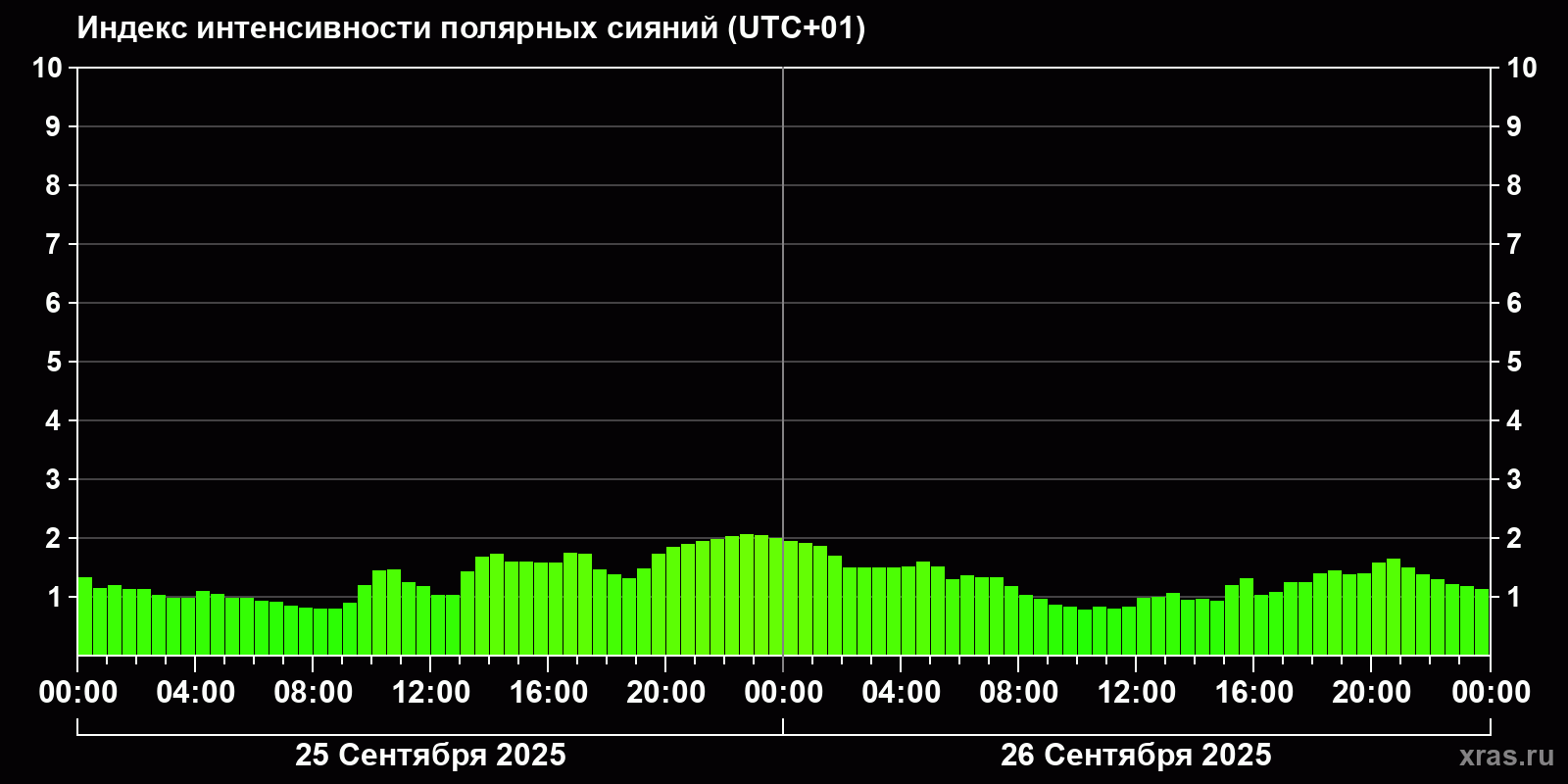 Изменения индекса интенсивности полярных сияний с 2025-09-25 по 2025-09-26 по местному времени