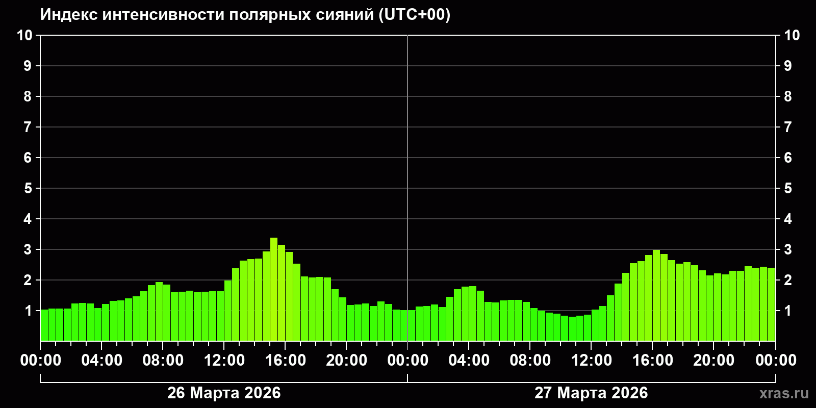 Изменения индекса интенсивности полярных сияний с 2026-03-26 по 2026-03-27 по местному времени