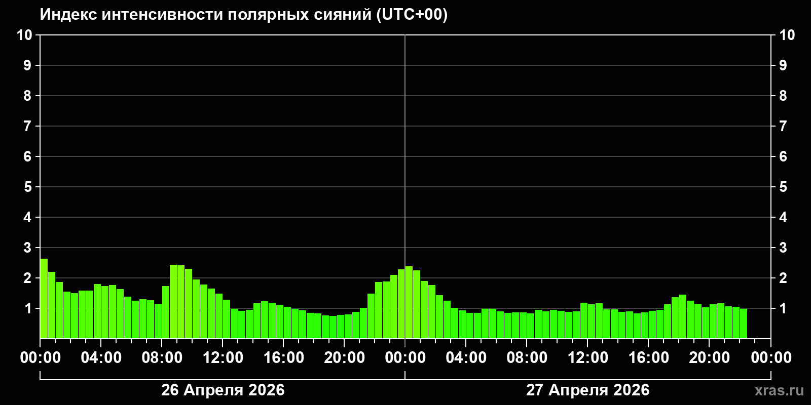 Изменения индекса интенсивности полярных сияний с 2026-04-26 по 2026-04-27 по местному времени