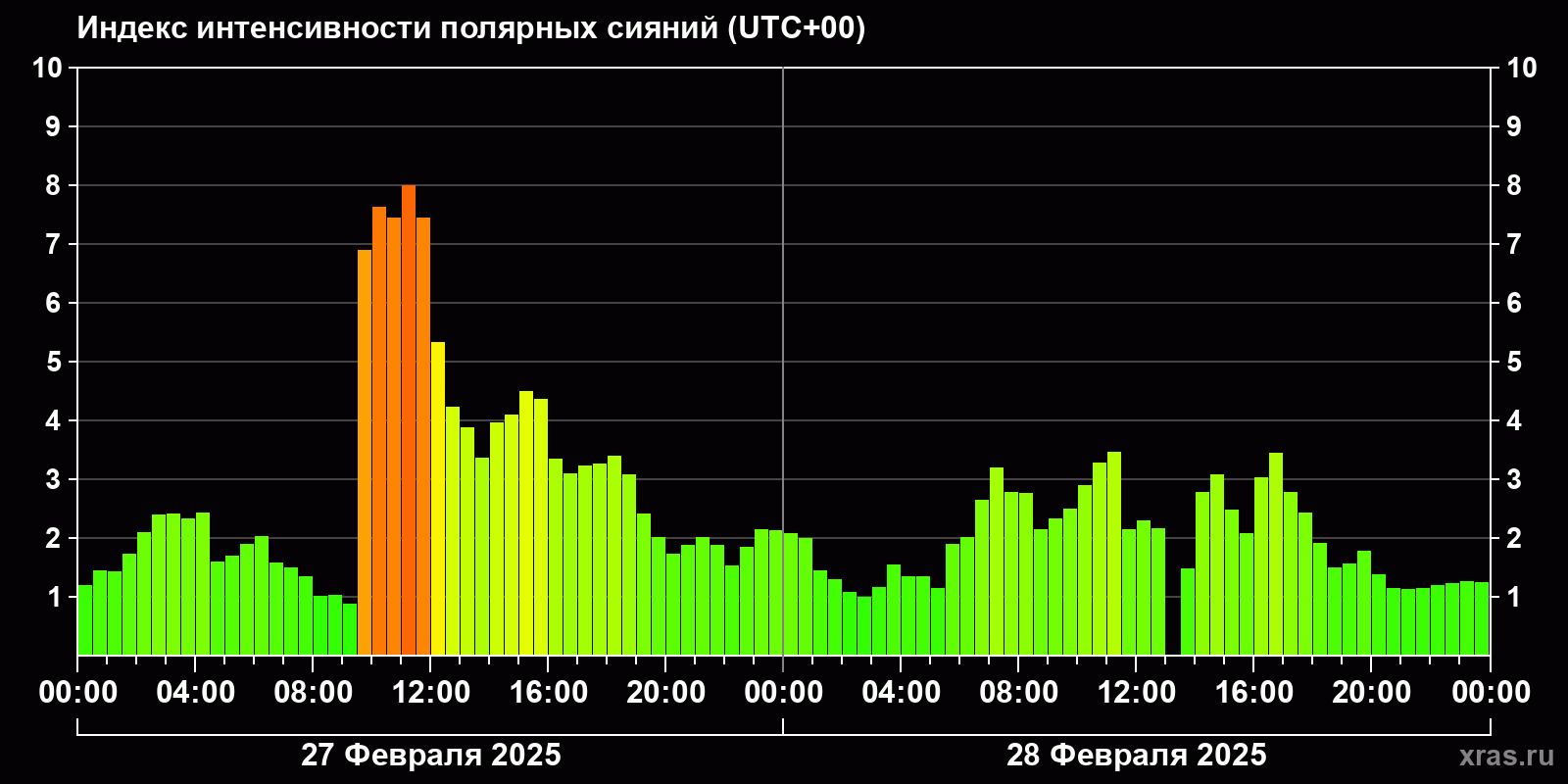 Изменения индекса интенсивности полярных сияний с 2025-02-27 по 2025-02-28 по местному времени