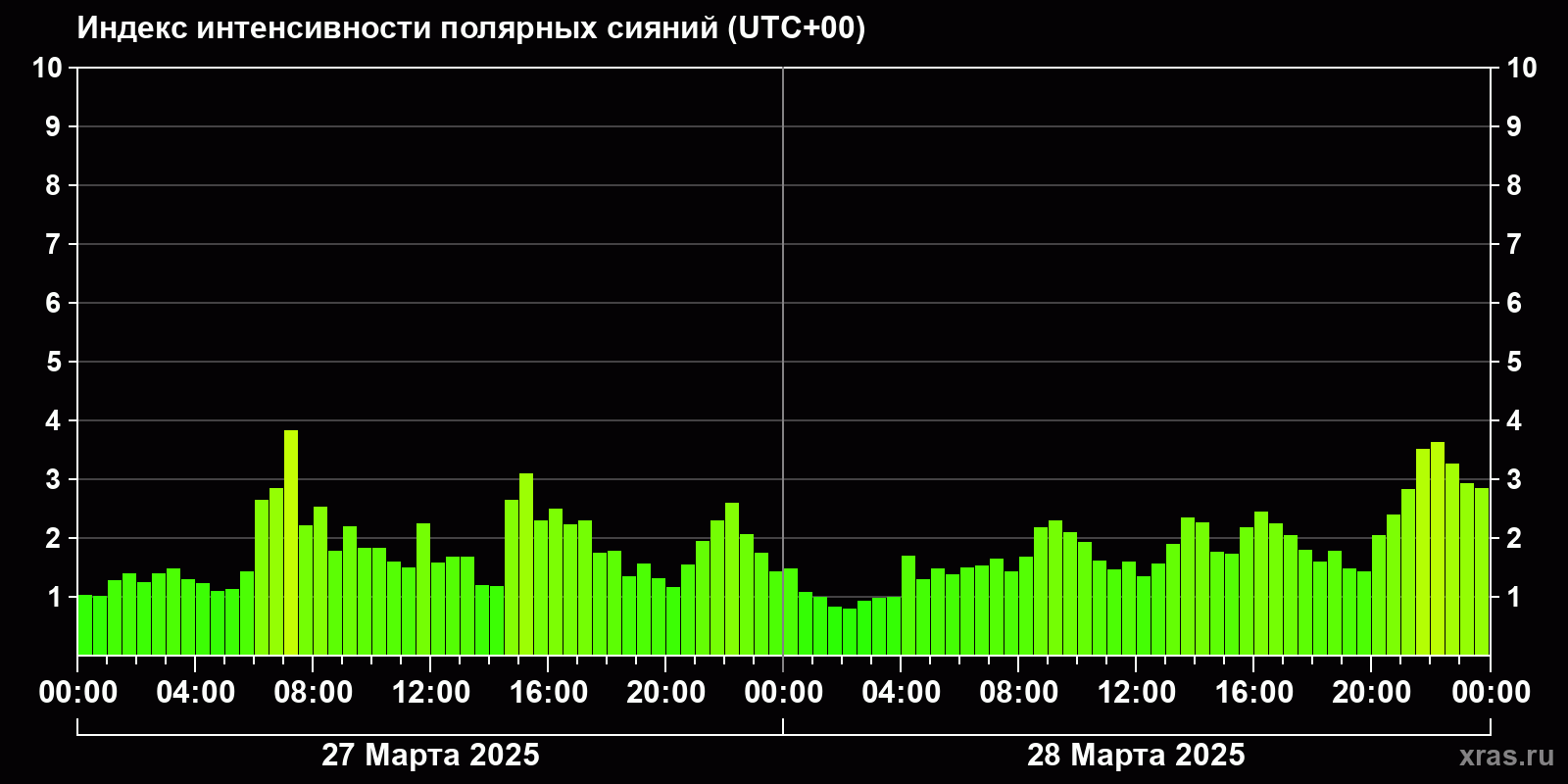 Изменения индекса интенсивности полярных сияний с 2025-03-27 по 2025-03-28 по местному времени