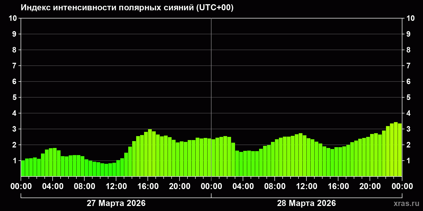 Изменения индекса интенсивности полярных сияний с 2026-03-27 по 2026-03-28 по местному времени