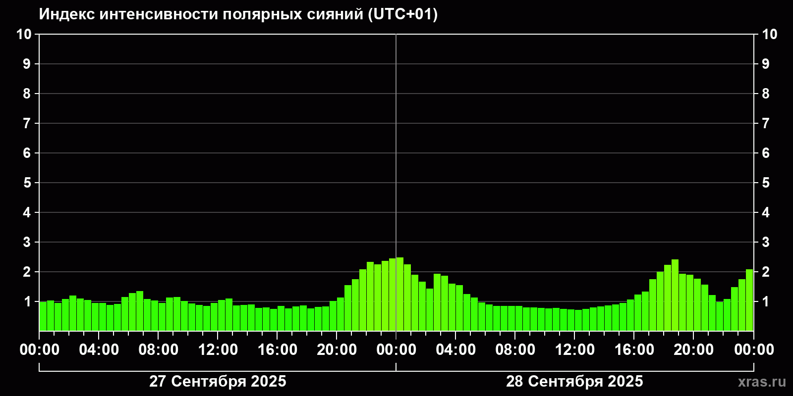 Изменения индекса интенсивности полярных сияний с 2025-09-27 по 2025-09-28 по местному времени