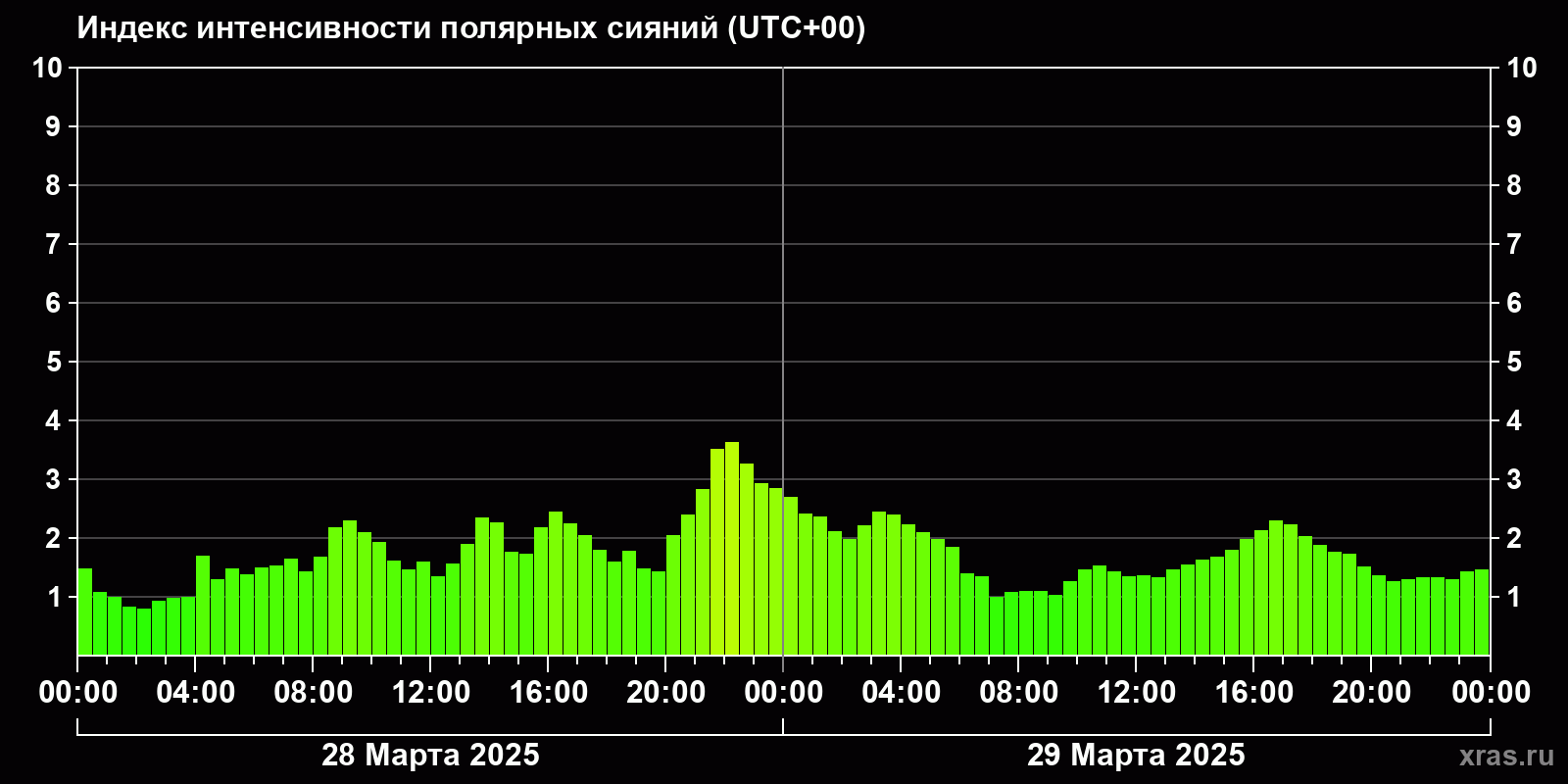Изменения индекса интенсивности полярных сияний с 2025-03-28 по 2025-03-29 по местному времени