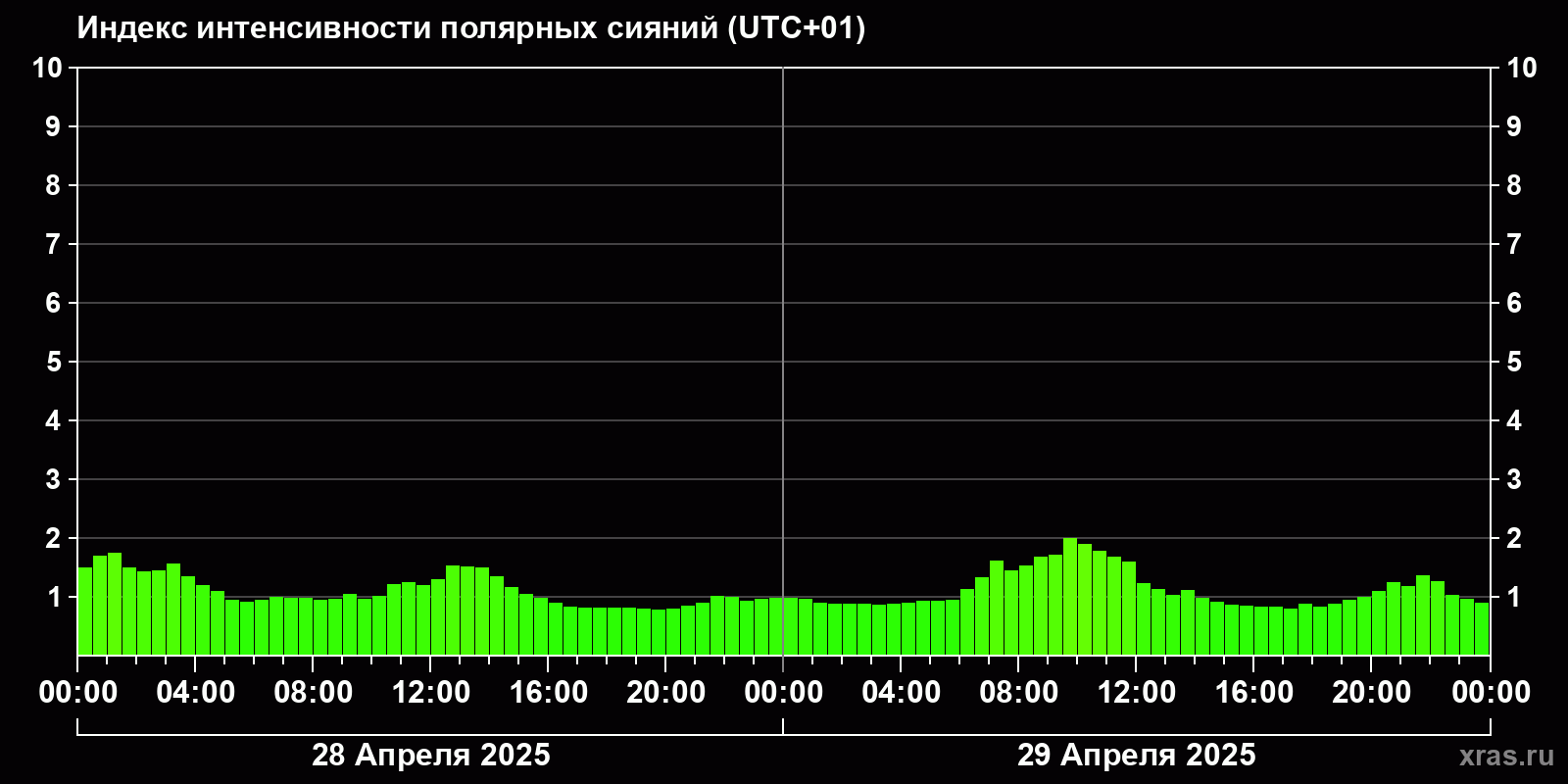 Изменения индекса интенсивности полярных сияний с 2025-04-28 по 2025-04-29 по местному времени