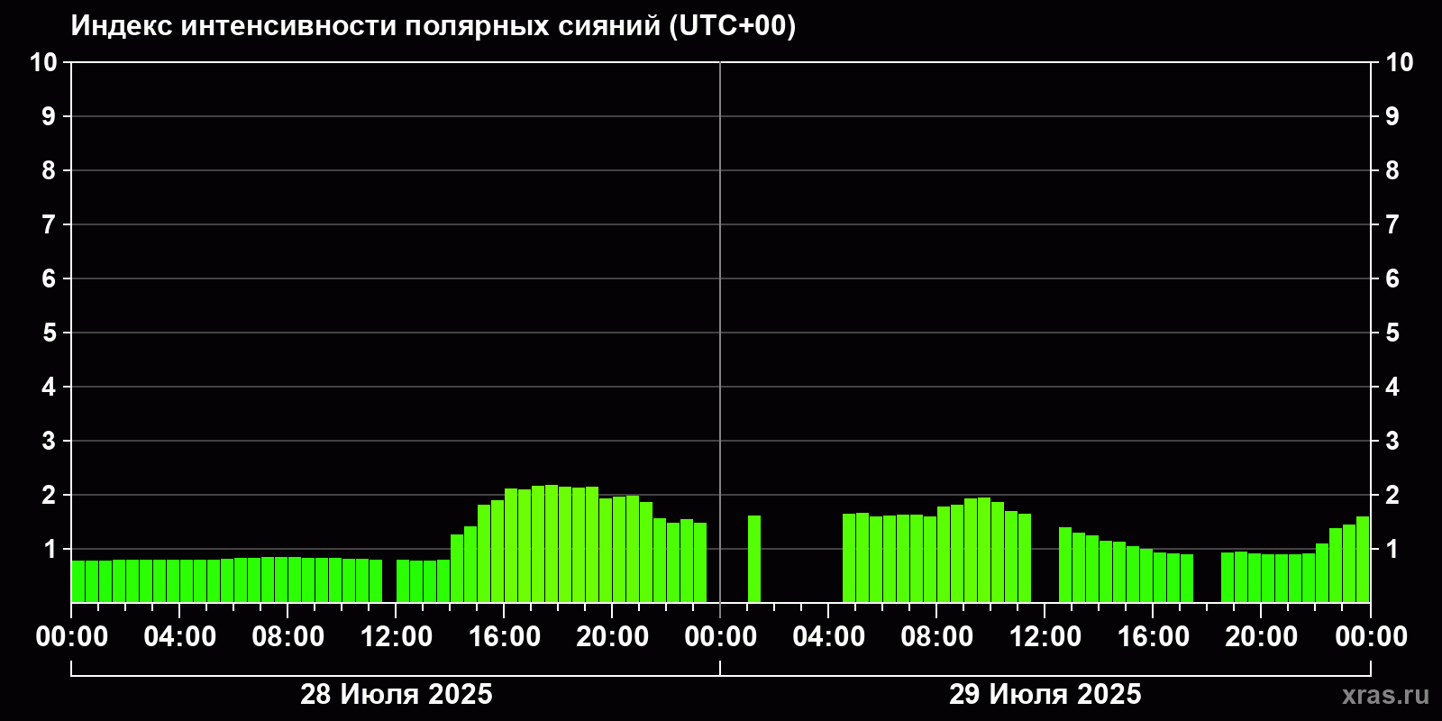 Изменения индекса интенсивности полярных сияний с 2025-07-28 по 2025-07-29 по местному времени